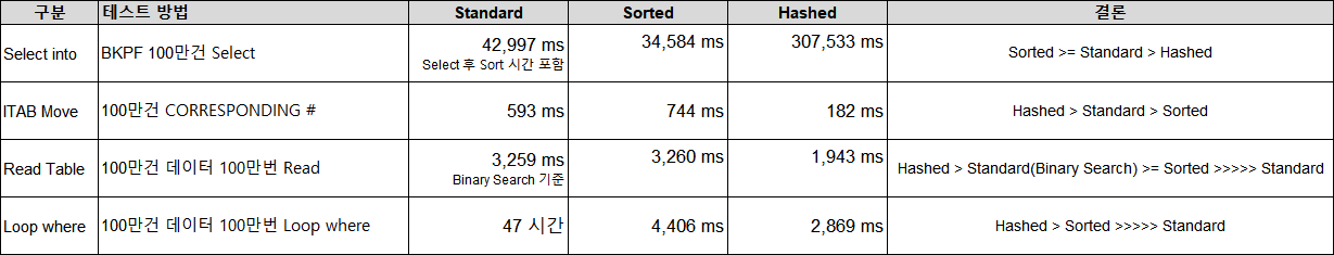 #1. Internal Table 성능 비교 (100만건 테이터 기준)