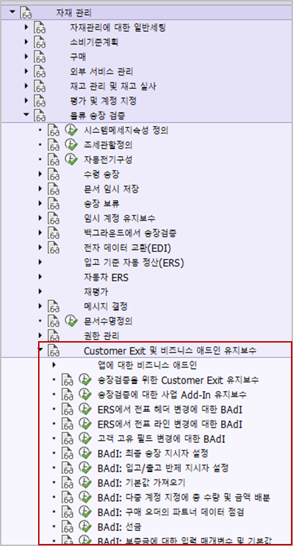 ‘시스템 적용‘, ‘확장’, ‘SAP 기능확장’, ‘User Exit’, ‘비즈니스 애드인’ 같은 명칭으로 되어 있으며 ‘문서’를 통해 사용법을 확인할 수 있습니다.