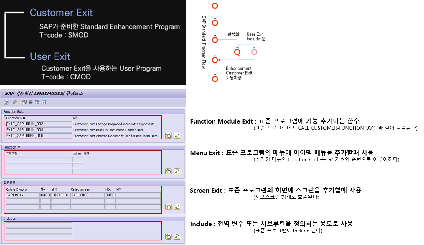 SMOD에서 SAP가 사전 정의한 Customer Exit을 CMOD에서 Project를 생성하여 ‘User Exit’으로 기능 활성화