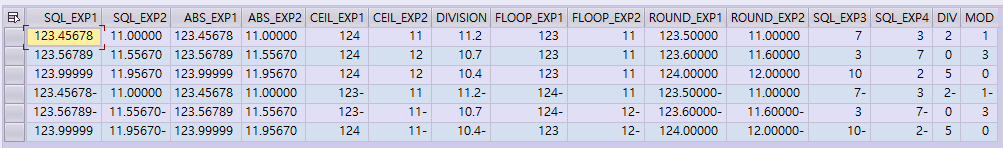 ( SQL_EXP1 = '-123.45678' SQL_EXP2 = '11.00000' SQL_EXP3 = -7 SQL_EXP4 = 3 )