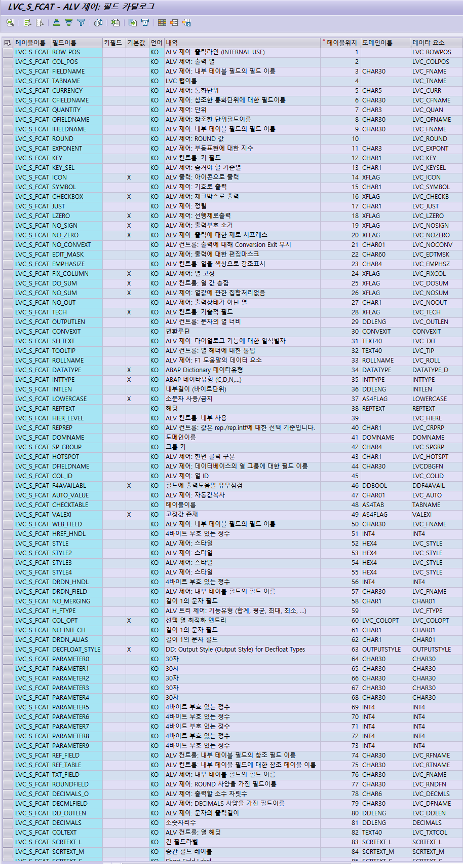 참고로, CL_SALV_DDIC 클래스에서 반환되는 형식(DDFIELDS)이 LCV_T_FCAT과 필드가 100% 매칭되진 않으니 일부 필드는 필드 카탈로그에 맞도록 변환이 필요합니다(예, POSITION -> COL_POS 등)