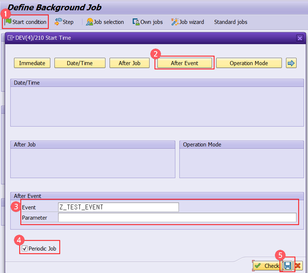 1) 시작 조건을 "After Event(이벤트 후)"로 선택 후 SM62에서 생성한 Event ID를 입력