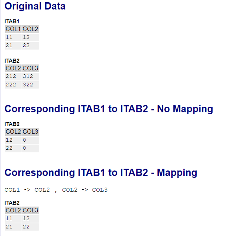 Structures struct or internal tables itab of the assigned data types must be passed to the parameters source and destination. An internal table of the type CL_ABAP_CORRESPONDING=>MAPPING_TABLE, containing the mapping rule, must be passed to the parameter mapping. If an initial mapping table is passed, only the identically named components are assigned. The mapping table has the following components:
